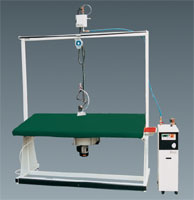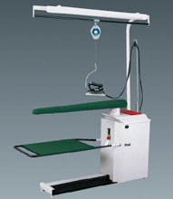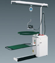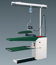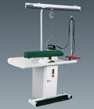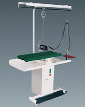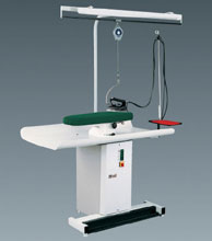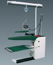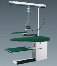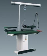 For dry-cleaning industry, finishing ironing table with vacuum and blowing function changeable automatically by the foot pedal. 500x1400mm heatable, aluminium flat ironing board with 1 kW heating element, controlled by a thermostat, 0,55 kW/380 V exhaust motor. Equipped with silicone iron mat and antenna for holding up the iron cables. Additional equipment: