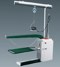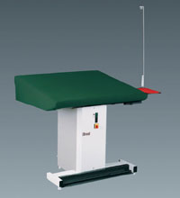For curtains manufacturers and laundries flattop ironing table with vacuum function. Heatable, specially perforated slanted ironing board, available in three sizes, 2 kW heating element, controlled by a thermostat, 0,55 kW/380 V exhaust motor. Equipped with silicone iron mat. Available sizes: