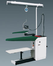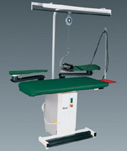 Flattop ironing table with vacuum and blowing function changeable automatically by the foot pedal. 630x1250mm heatable, specially perforated ironing board with 1 kW heating element, controlled by a thermostat, 0,55 kW/380 V exhaust motor. This table is also height-adjustable. Equipped with silicone iron mat and antenna for holding up the iron cables. Additional equipment: